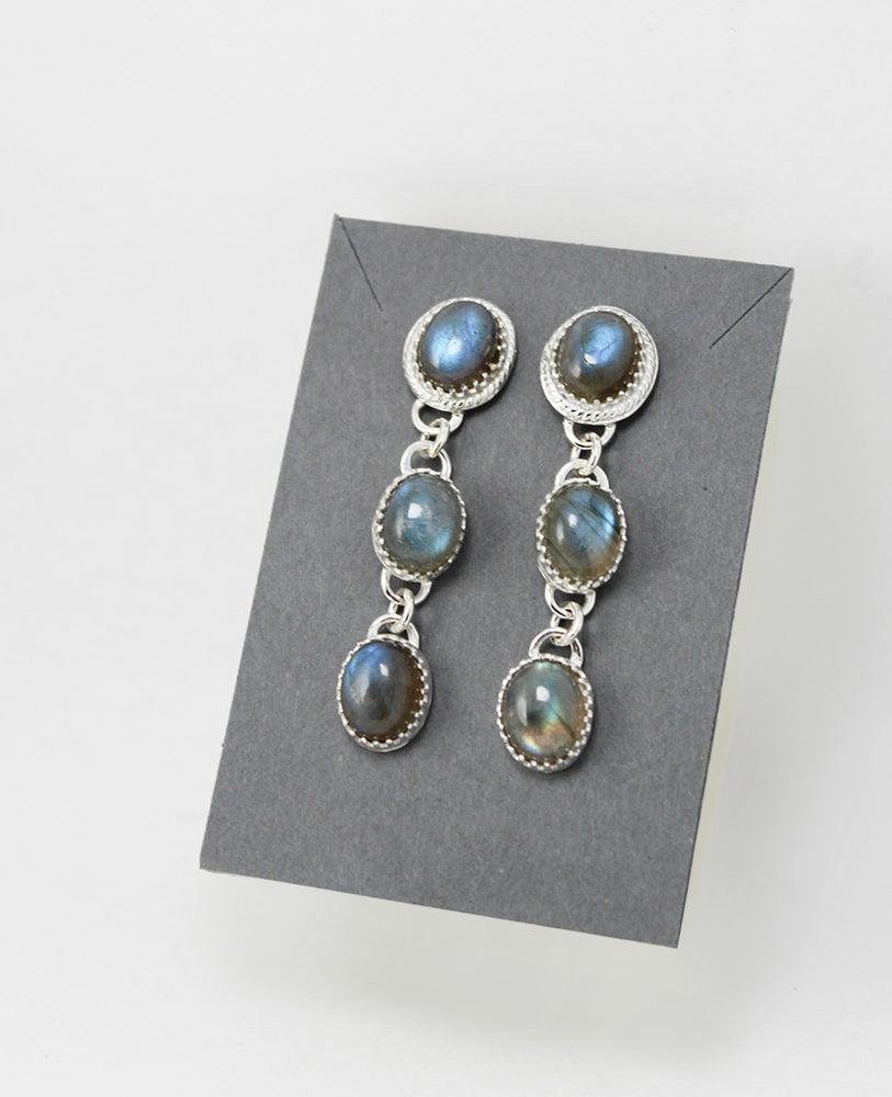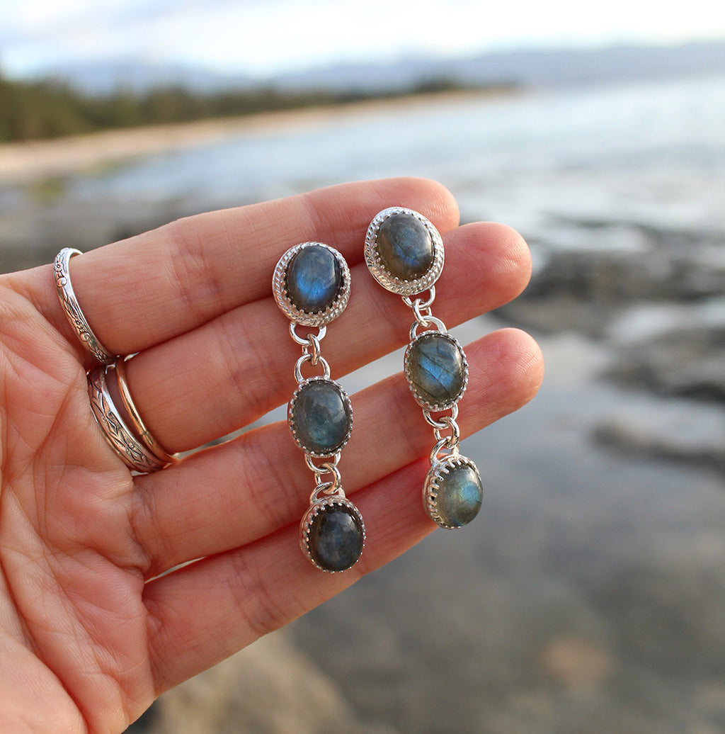 Three shimmering drops of blue Labradorite drip from each hand-crafted .925 Sterling Silver earring, with interlocking connection points to allow them to swing freely as you move. Ornate bezels offset the gems, with settings and components polished to a high shine.